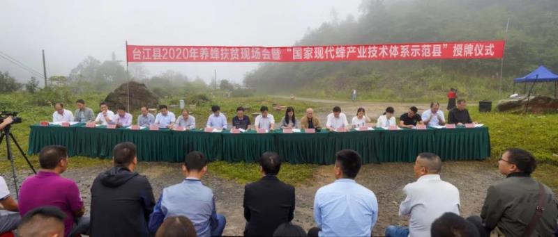 9月8日,貴州省臺江縣2020年養(yǎng)蜂扶貧現(xiàn)場會暨“國家現(xiàn)代蜂產(chǎn)業(yè)技術(shù)體系示范縣”授牌儀式在臺拱街道紅陽村地質(zhì)公園大門口舉行。全國蜂產(chǎn)品標準化工作組副組長趙小川,中國蜂產(chǎn)品協(xié)會副秘書長譚麗蕊,中國知名養(yǎng)蜂專家徐祖蔭,省農(nóng)科院副院長陳永祥,省農(nóng)科院宣教處處長裴曉紅,縣領(lǐng)導(dǎo)吳世勝、全宏超、楊德昭、任四平、張博根、唐成萬等領(lǐng)導(dǎo)參加授牌儀式。授牌儀式由縣委副書記楊德昭主持。
